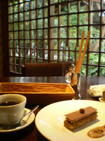 僕はこの中庭に面した格子窓脇のテーブルへ付き、チョコ系のデザートとコーヒーを。